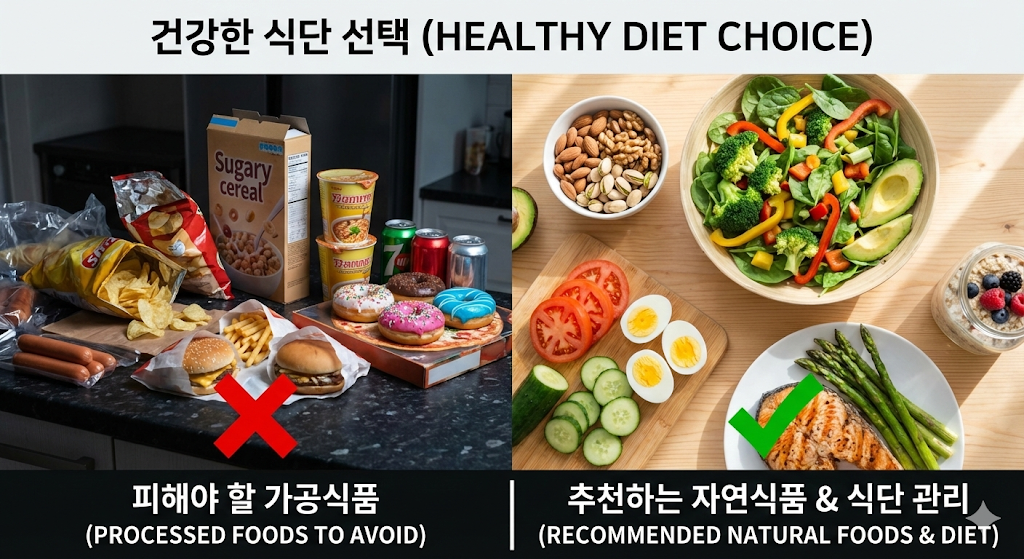 '80:20의 법칙'을 제안합니다. 식단의 80%를 비가공 식품으로 채우고, 20%는 사회생활이나 즐거움을 위해 유연하게 허용하되, 성분표를 확인하는 습관을 들이세요.