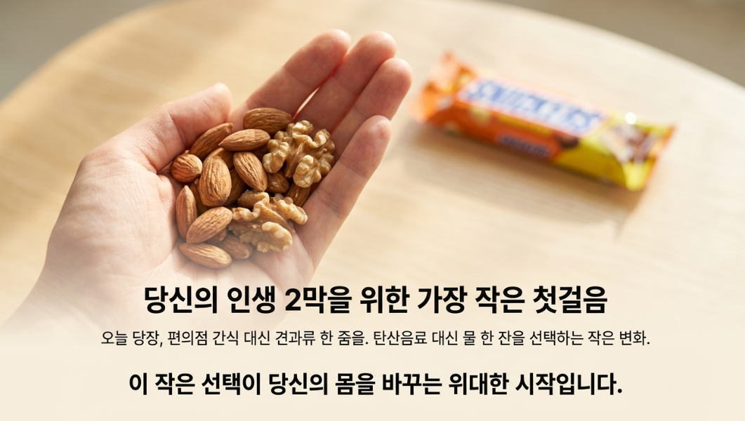 오늘 당장 편의점 간식 대신 견과류 한 줌, 탄산음료 대신 물 한 잔을 선택하는 작은 변화가 여러분의 인생 2막을 건강하게 지탱할 것입니다.
