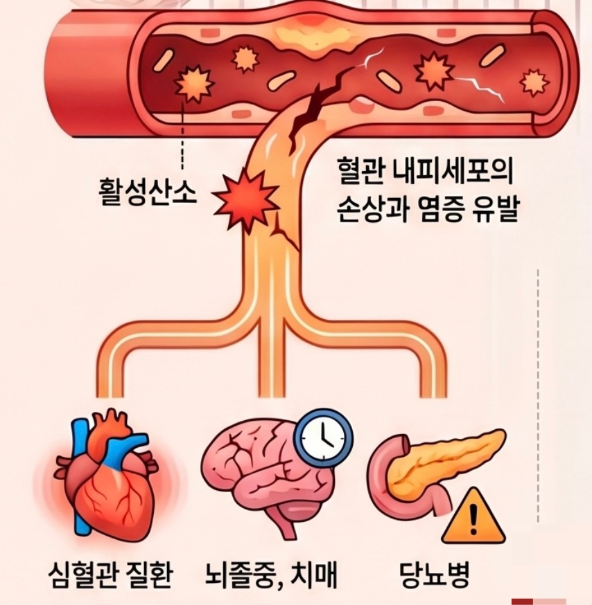 혈당이 급격히 오를 때 발생하는 활성산소는 혈관 벽을 공격하여 염증을 유발합니다.