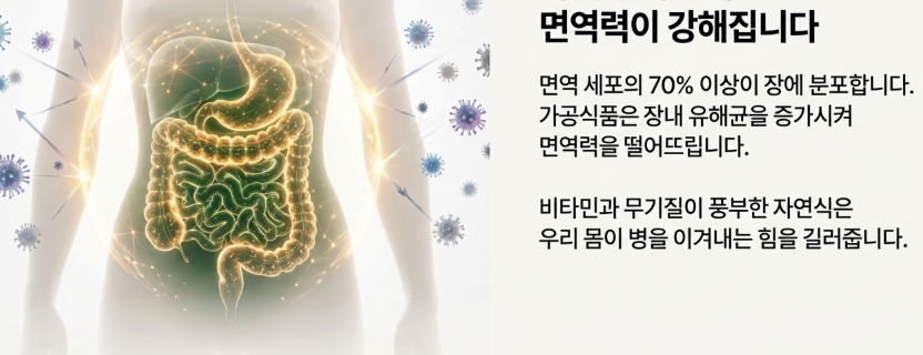 가공식품은 장내 환경을 악화시켜 유해균을 증식시키고 면역력을 떨어뜨리지만, 이를 끊고 항산화 성분이 풍부한 음식을 섭취하면 병을 이겨내는 자생력이 생깁니다.