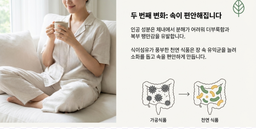 장은 '제2의 뇌'라 불릴 만큼 중요하며, 가공식품을 멀리하는 것만으로도 장 속 환경을 정화할 수 있습니다.