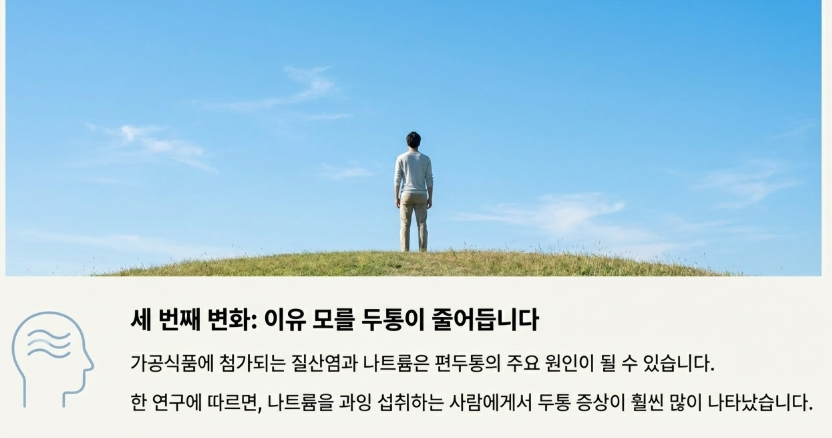 의학적 연구에 따르면, 가공식품에 포함된 질산염과 나트륨은 혈압 수치와 무관하게 편두통의 주요 원인이 됩니다. 나트륨 섭취를 제한하는 것만으로도 고질적인 두통 증상을 완화할 수 있습니다.