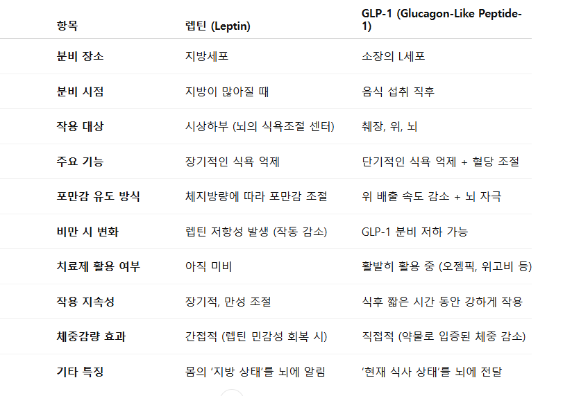 아래 차트는 렙틴과 GLP-1의 작용 부위와 주요 기능을 시각적으로 비교합니다.