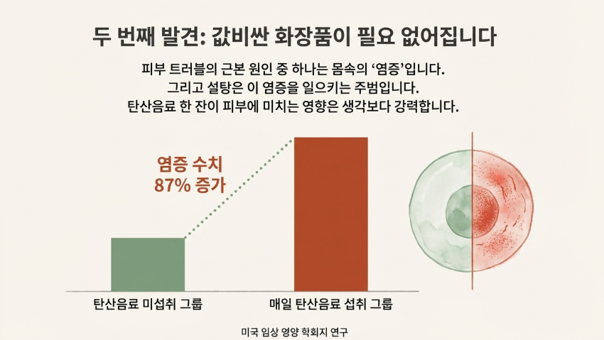 체내 염증은 여드름 등 각종 피부 트러블의 근원입니다. 연구에 따르면 3주 동안 매일 탄산음료 350ml를 마신 사람은 그렇지 않은 사람보다 염증 수치가 무려 87%나 높았습니다. 설탕 끊기는 고가의 피부 관리보다 훨씬 효과적인 항염 치료제가 됩니다.