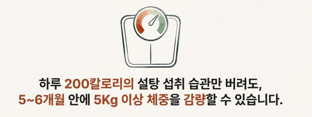 마지막으로 가장 가시적인 변화는 체중 감량입니다. 하루 200칼로리의 설탕 섭취 습관만 버려도 5~6개월 안에 약 5kg 이상의 체중을 감량할 수 있다는 데이터가 이를 증명합니다.