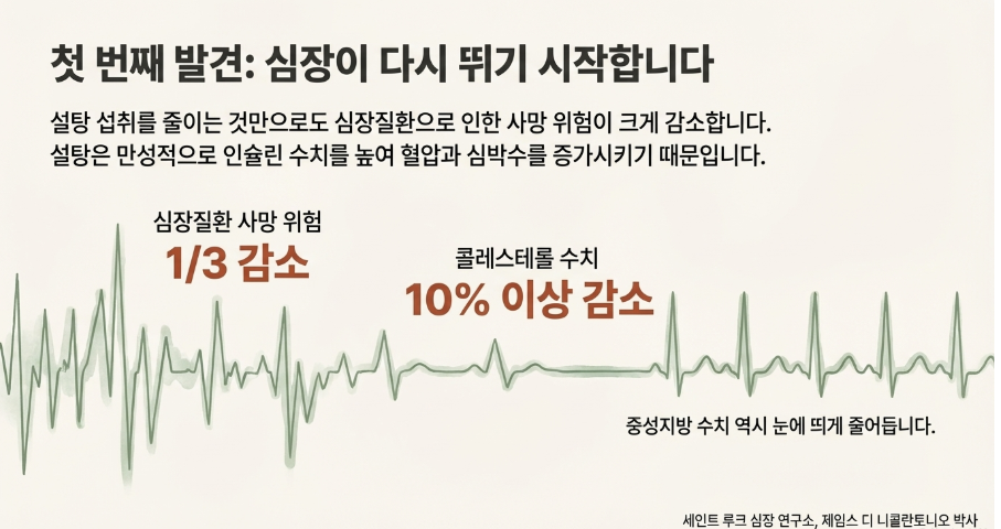 설탕 끊기를 시작하면 가장 먼저 심장이 안정을 찾습니다. 세인트 루크 심장 연구소의 제임스 디 니콜란 토니오 박사에 따르면, 설탕 섭취를 줄이는 것만으로도 심장질환으로 인한 사망 위험을 3분의 1 수준으로 낮출 수 있습니다. 설탕은 인슐린 수치를 만성적으로 높여 혈압과 심박수를 상승시키기 때문입니다. 이를 중단하면 몇 주 내에 콜레스테롤 수치가 10% 이상 감소하고 중성지방 수치 또한 눈에 띄게 개선되는 임상적 변화를 경험하게 됩니다.