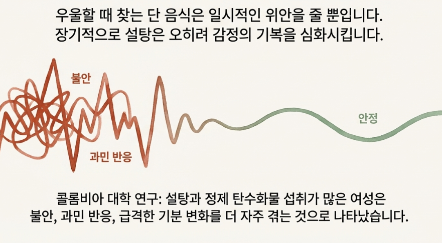 당이 떨어질 때 단 음식을 찾는 습관은 일시적인 기분 전환일 뿐입니다. 콜롬비아 대학 연구팀은 설탕과 정제 탄수화물 섭취가 잦은 여성일수록 불안, 과민 반응, 감정 기복을 더 심하게 겪는다고 밝혔습니다.