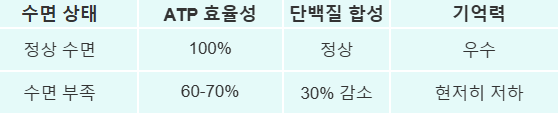 수면 부족 시 ATP 합성효소 대신 열 생성으로 에너지가 낭비되어, 뇌가 제대로 작동하기 어려운 상태가 됩니다.