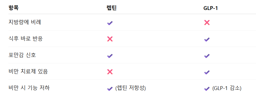 헷갈리기 쉬운 두 식욕 억제 호르몬, ‘렙틴(Leptin)’과 ‘GLP-1(Glucagon-Like Peptide-1)’의 차이를 명확히 비교해드릴게요.