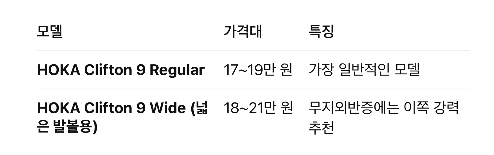 제 아내처럼 평발 + 무지외반증이 있는 분께 적합하면서도 스타일리시한 운동화를 찾는다면, 호카 오네오네 클리프톤 9 (HOKA Clifton 9) 은 정말 탁월한 선택입니다.