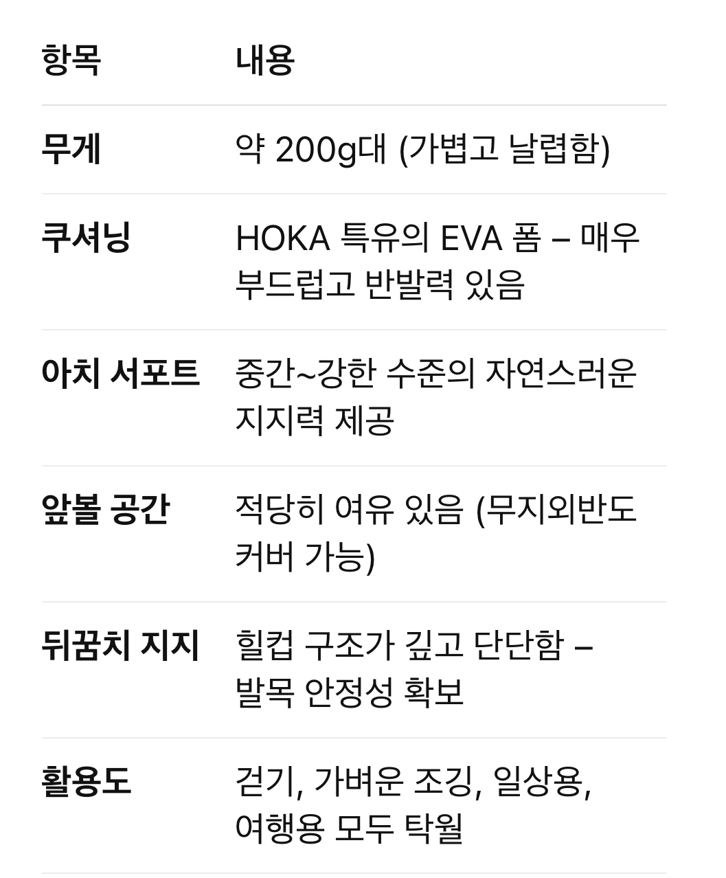 착용감은 가볍고 멋지지만, 관절 안정성이나 오버프로나이션(발 안쪽으로 무너짐) 제어력은 낮은 편입니다.