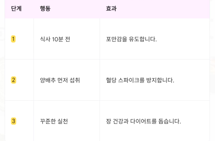 식사 10분 전 양배추를 먼저섭취하는 '선(先) 채소 식법'은 포만감을 유도할 뿐만 아니라, 장내 유익균의 먹이인 프리바이오틱스 역할을 하여 장 건강까지 동시에 챙길 수 있습니다. 이는 효과적인 다이어트 식단 구성의 핵심 전략입니다.