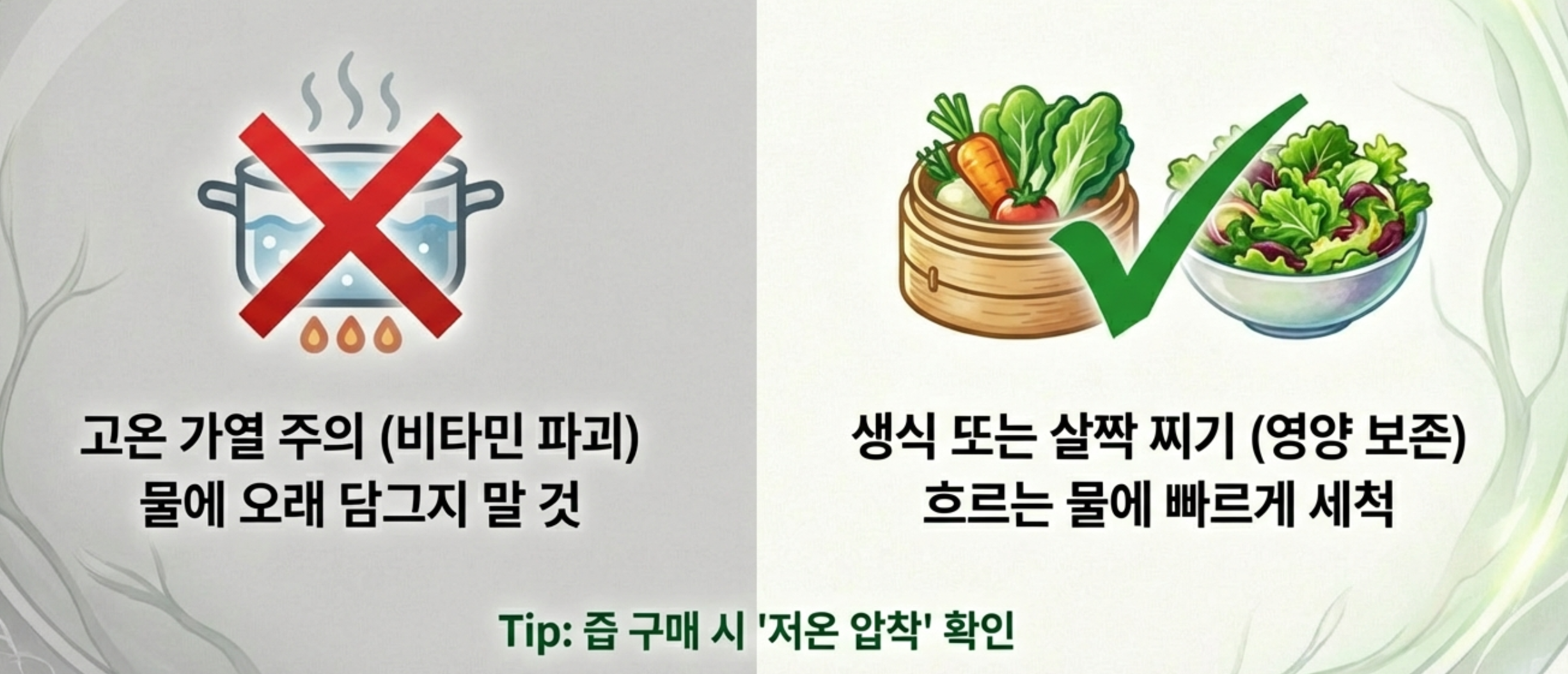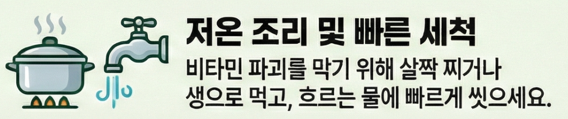 열에 약한 수용성 비타민 보존을 위해 가급적 생으로 먹거나 살짝 쪄서 먹는 것이 좋습니다.